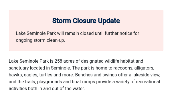 Consequently, there is no firm timeline, and with such extensive damage throughout the park, it’s likely Lake Seminole Park will remain closed and will not open for a few to several months.